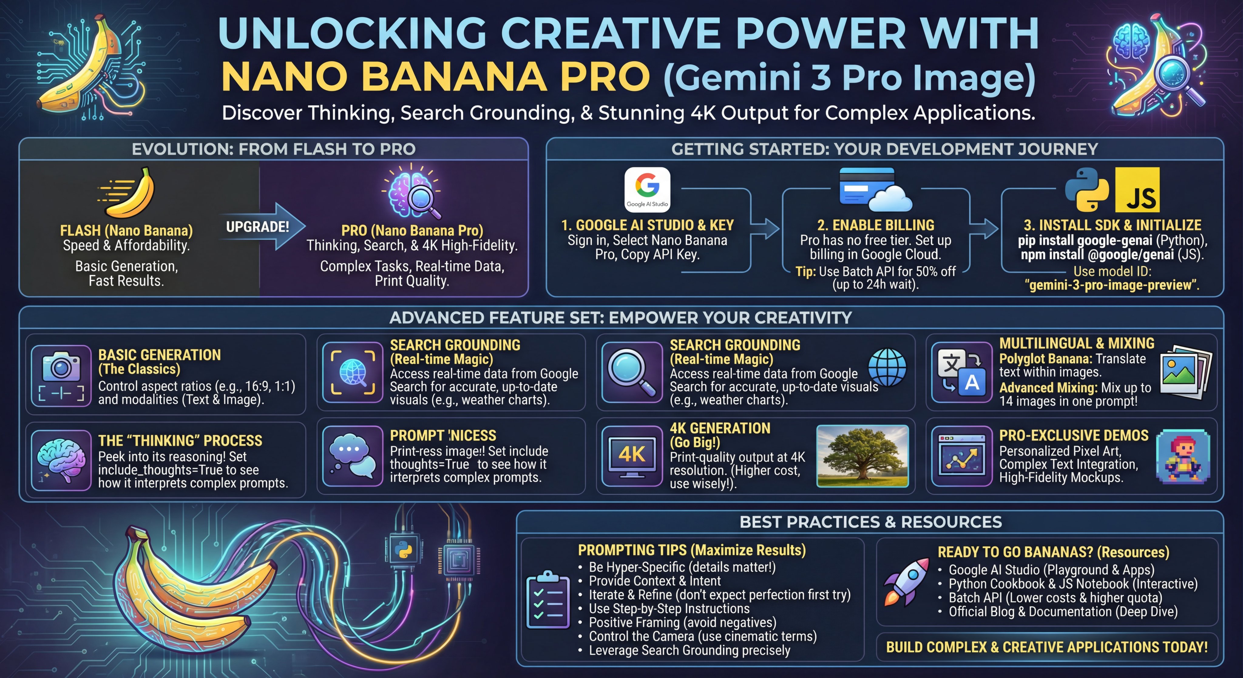 如果说 Flash 模型(Nano Banana)是速度与性价比的王者,那么 Pro 版本则是一位拥有“大脑”的艺术家——它具备推理能力,能结合实时搜索结果,还能输出电影级的 4K 高清图像。是时候用它来搞点大事了!