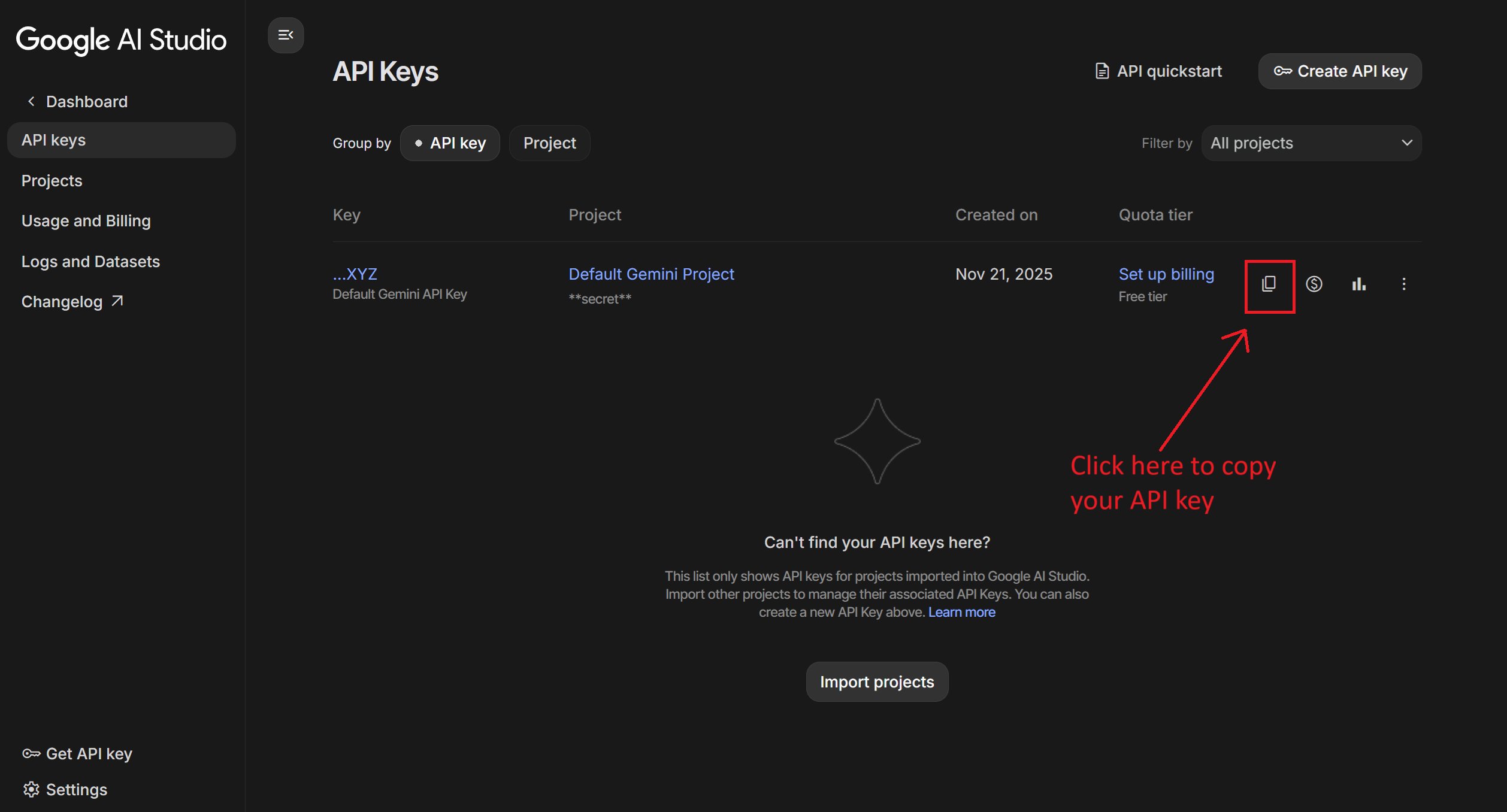 打开 API 密钥管理页面,点击“复制”图标保存你的密钥。