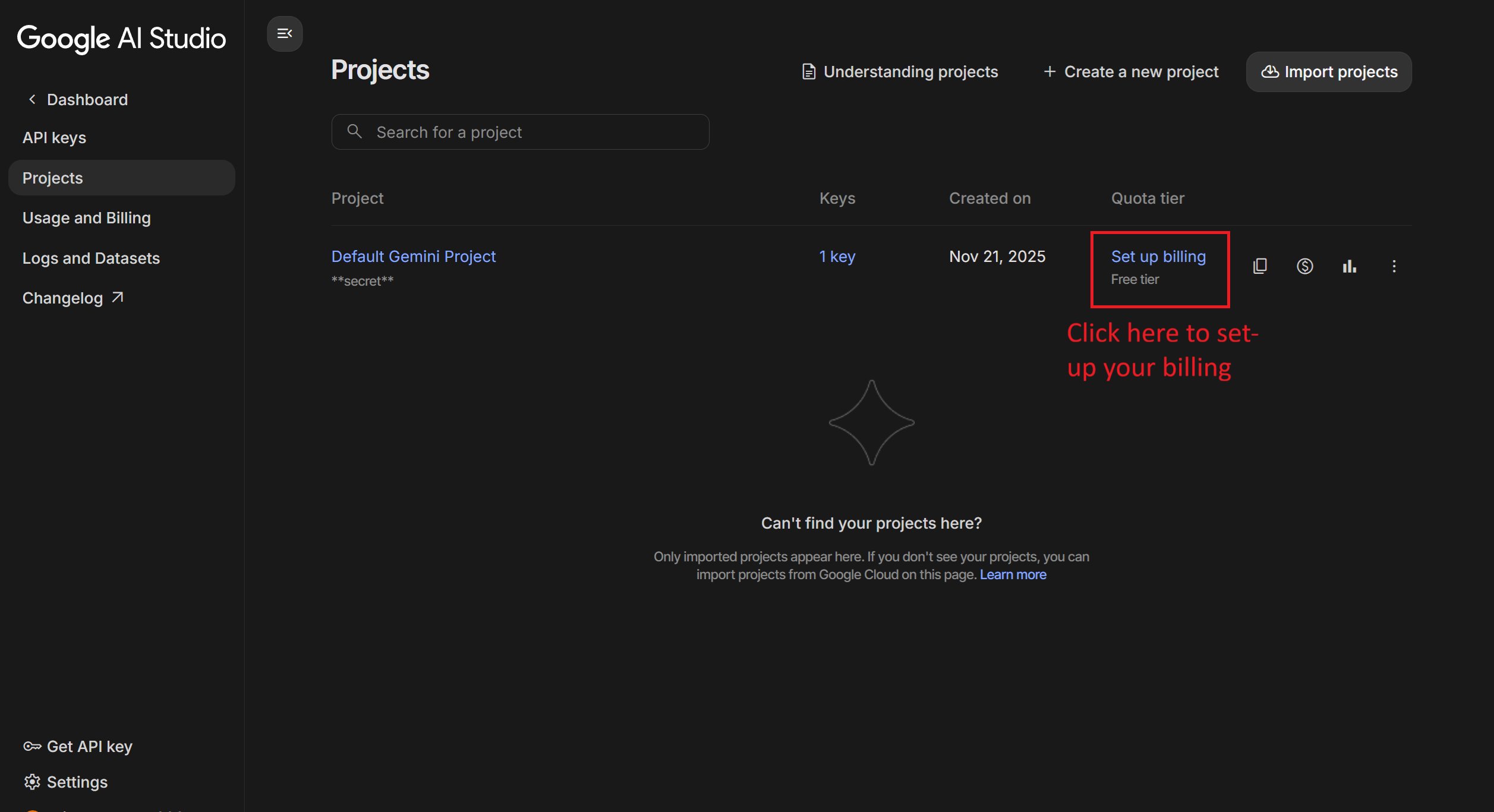 在 API 密钥管理页面,点击你项目旁边的“设置计费(Set up billing)”,然后按照屏幕提示操作即可。