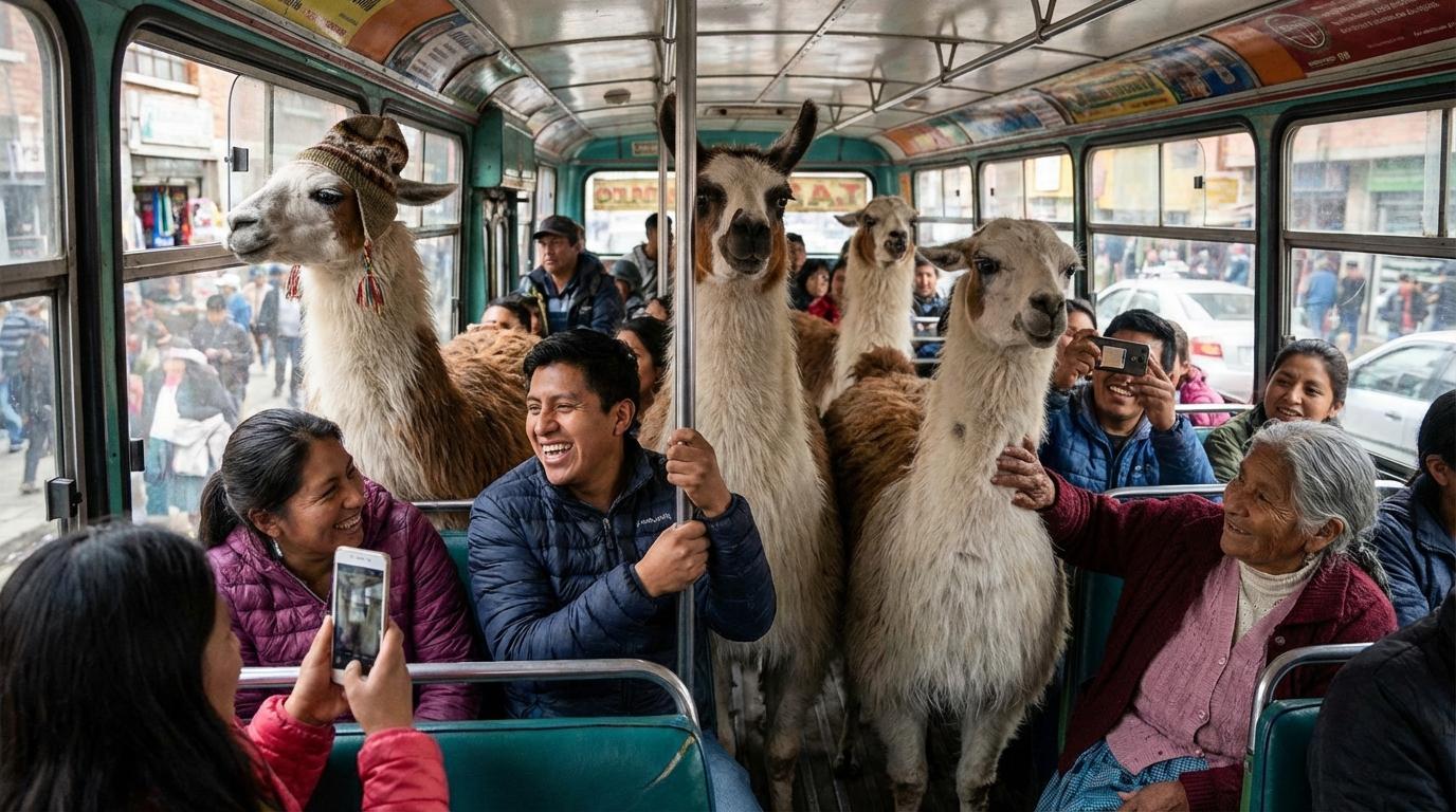 I'm focusing on the llamas now. The goal is to capture them asdaily commuters on a bustling bus in La Paz, Bolivia. My planinvolves a vintage bus crammed with amused passengers. The imagewill highlight details like one llama looking out the window,another interacting with a passenger, all while people takephotos.(我现在专注于羊驼。目标是捕捉它们作为日常通勤者在玻利维亚拉巴斯拥挤的公交车上的场景…)