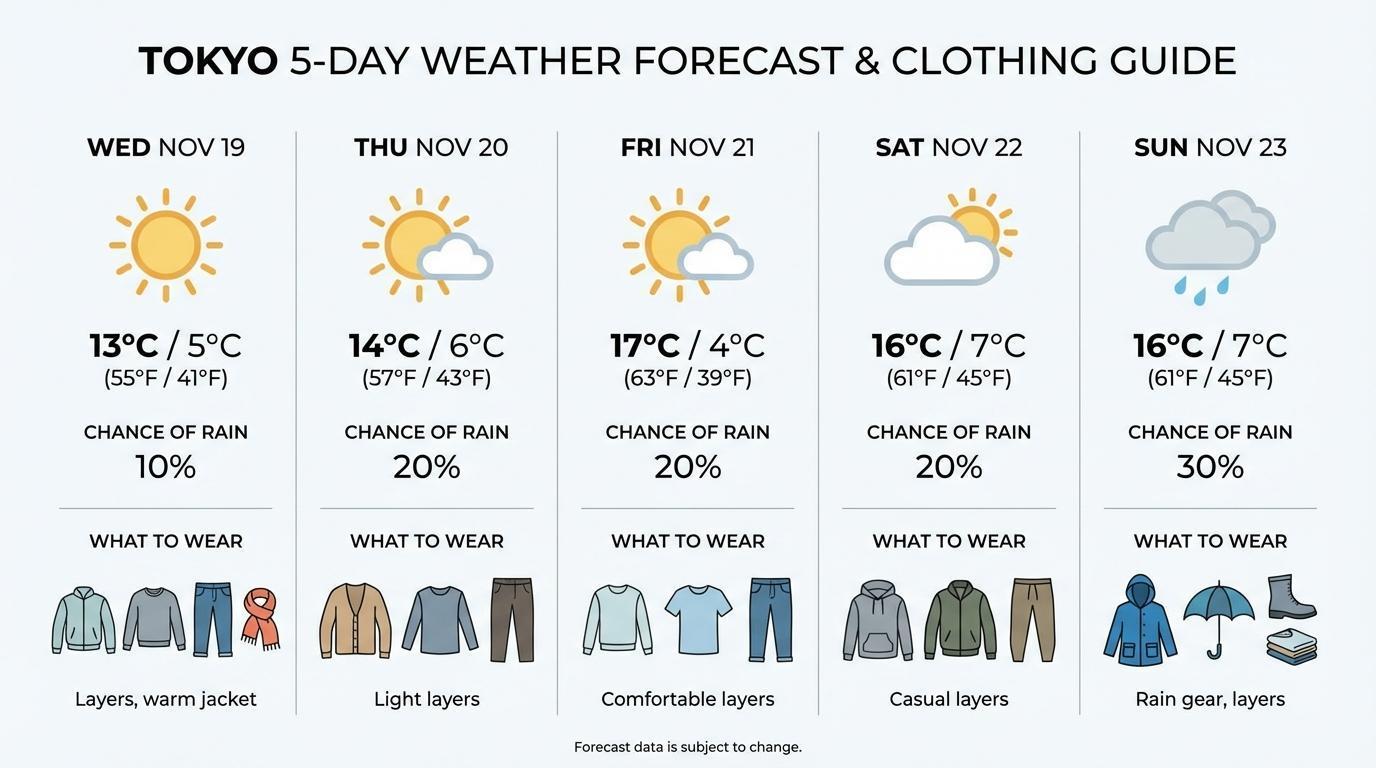 prompt = "Visualize the current weather forecast for the next 5 days in Tokyo as a clean, modern weather chart. add a visual on what i should wear each day"# 将东京未来5天的天气预报可视化为一张简洁现代的天气图表,并加上每天穿衣建议的视觉元素