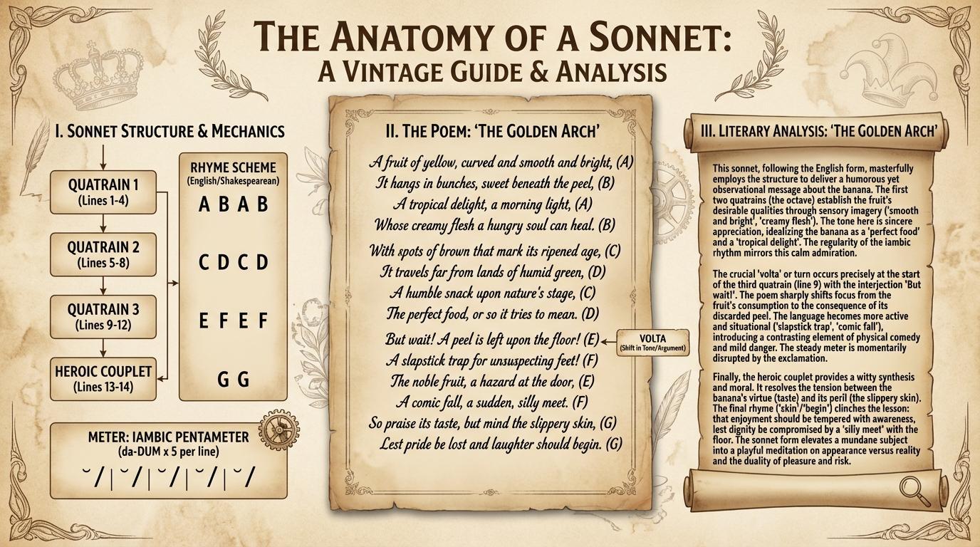 Prompt: “Show me an infographic about how sonnets work, using a sonnet about bananas written in it, along with a lengthy literary analysis of the poem. Good vintage aesthetics” (展示一张关于十四行诗如何运作的信息图,其中要包含一首关于香蕉的十四行诗,以及对该诗的长篇文学分析。采用好看的复古美学风格。)