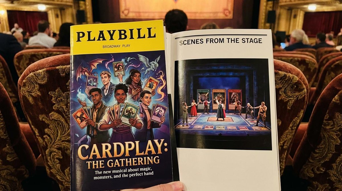 Prompt: “A photo of a program for the Broadway show about TCG players on a nice theater seat, it’s professional and well made, glossy, we can see the cover and a page showing a photo of the stage.” (一张关于集换式卡牌玩家的百老汇演出节目单的照片,放在漂亮的剧院座椅上,制作专业精良,有光泽感,我们可以看到封面和展示舞台照片的内页。)