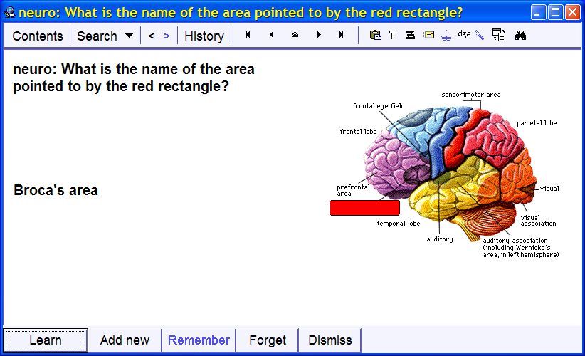 | 如何用剪贴板里的图片快速生成图片挖空: 1. 按 Shift+Ins 将图片粘贴到 SuperMemo。 2. 按 Ctrl+Shift+M 并选择 Occlusion(遮挡)模板来应用图片挖空模板。 3. 仅限 SuperMemo 2000:按 Ctrl+Shift+F2 来应用并固定 Occlusion 模板。 4. 填写字段,并将遮挡矩形拖到图片上合适的位置(使用 Alt+ 点击 两次来激活矩形的拖动模式)。 | 在 SuperMemo 99 中,你需要更多步骤: 1. 创建一个包含以下组件的卡片: – 问题文字:红色矩形覆盖的区域叫什么? – 空白的答案文字(在组件菜单点击 Answer)。 – 你的插图(在图片组件菜单使用 Import file)。 – 红色矩形组件(在矩形组件菜单用 Color 选择红色)。 2. 在元素菜单选择Duplicate(复制)(例如按 Ctrl+Alt+U)。 3. Ctrl+ 双击矩形组件,使其进入拖动模式。 4. 拖动并调整红色矩形的大小,以覆盖目标区域。 5. 在答案区域输入答案。 6. 按 PgUp 返回到第 1 步创建的原始模板。 7. 回到第 2 步,生成更多的图片挖空卡片。 注意,你也可以在原始图片上画遮挡的矩形或圆形,但这会大大增加你的知识库体积。上述方法确保了你可以在所有使用相同模板的卡片中重复使用同一张图片。例如,SuperMemo Library 和 SuperMemo MegaMix CD-ROM 中的“大脑解剖学”知识库就使用了这种技术。 |